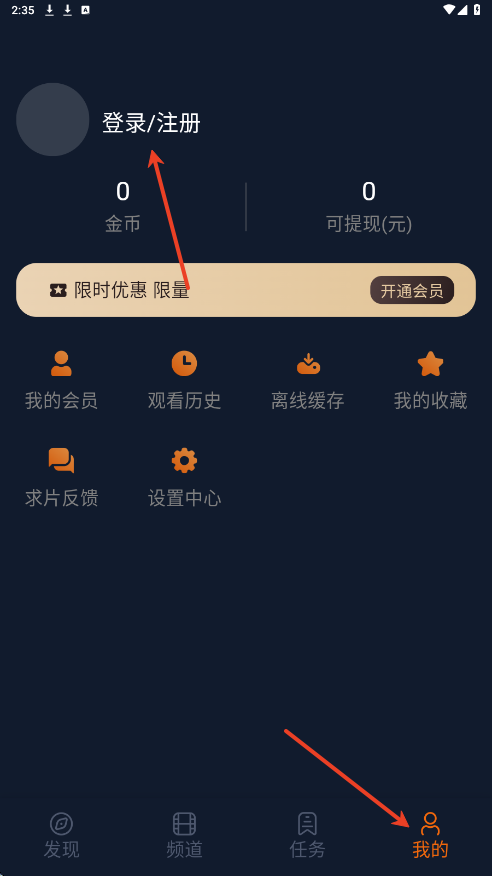 1.打开app,点击【我的】,点击【登录/注册】。