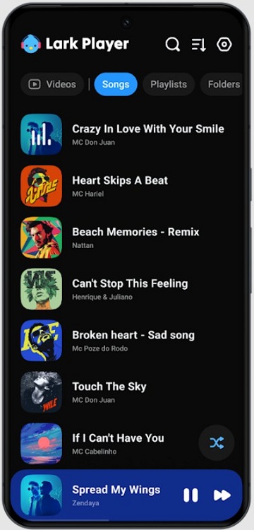 ①当我们手机本地下载了部分音乐之后,进入到Lark Player app的音乐板块中是会自动读取到的,所以这个时候大家只需要选择自己下载的音乐播放即可;