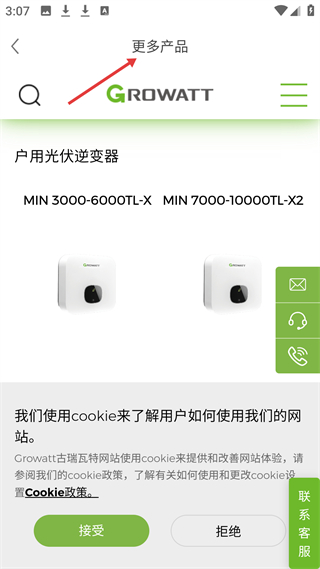 3、GROWATT产品页,展示户用光伏逆变器系列,属更多产品板块,让用户了解其光伏逆变器产品。