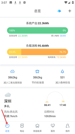 1、总览页,展示系统产出、负载消耗、环保数据及深圳天气日照,助力用户掌握能源整体情况。