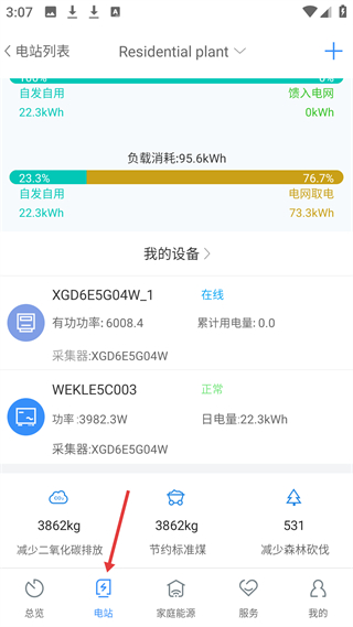 2、电站页呈现电站列表与设备详情,如WEKLE5C003功率3982.3W日电量22.3kWh,便于用户管理光伏设备。