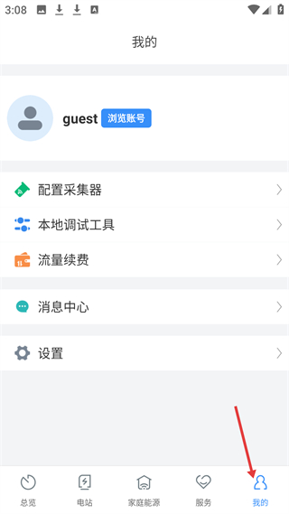 4、我的页面,显示guest浏览账号,含配置采集器、流量续费等功能,方便用户进行账号及相关操作。
