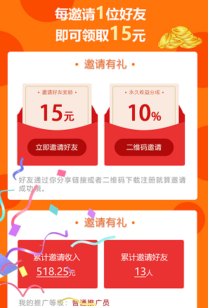 邀请赚钱:每邀请一位好友,可领取15元现金;