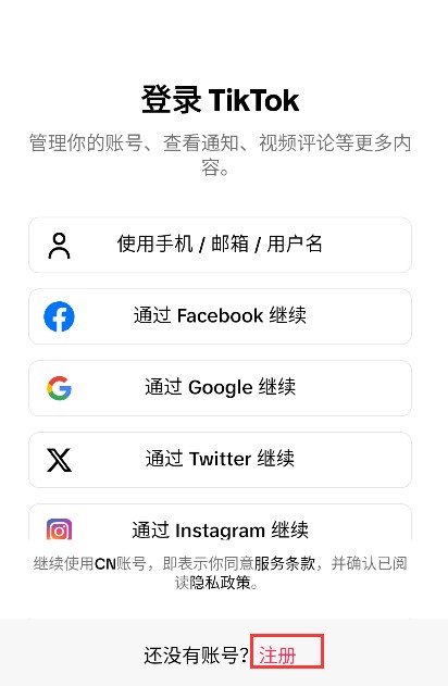 3、登录TIKTOK可以使用以下账号直接登录,没有的可以点击下方的注册。