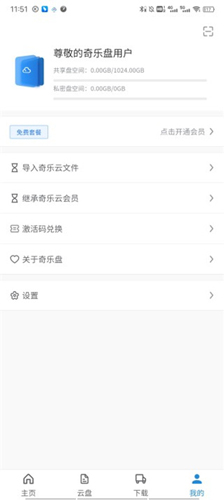 4、在我的页面中,可查看设置选项及共享云盘、私密云盘的空间使用情况。