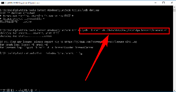14、待我们的设备列举出来后,输入命令“.adb -d shell sh /data/data/me.piebridge.brevent/brevent.sh”,从而完成我们对黑域手机端的授权;
