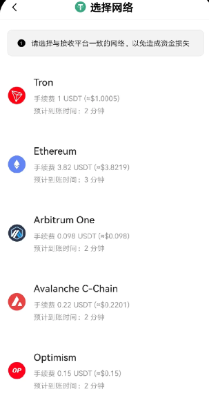 选择和汇入方地址一致的链或网络。 在提现的时候,一定要选择与充币平台相同的链和网络。