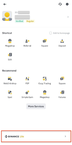 1. 点击首页左上角的币安图标,然后选择底部的【币安简易版】,切换至简易版模式。