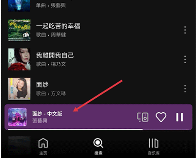 2、搜索结果出来后点击你收听的歌曲,播放后点击下方的歌曲进入播放界面