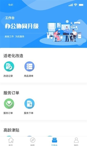 4、进入工作台板块,可轻松操作适老化改造、订单管理等功能;
