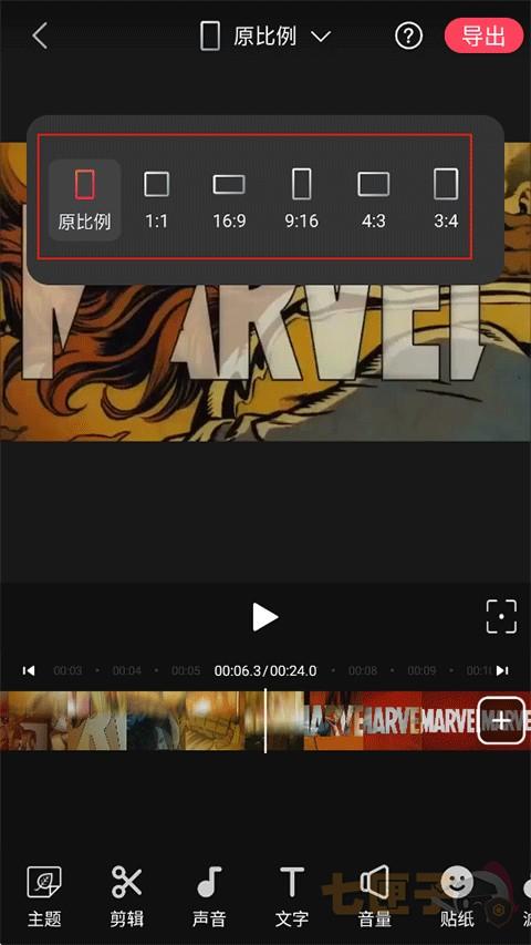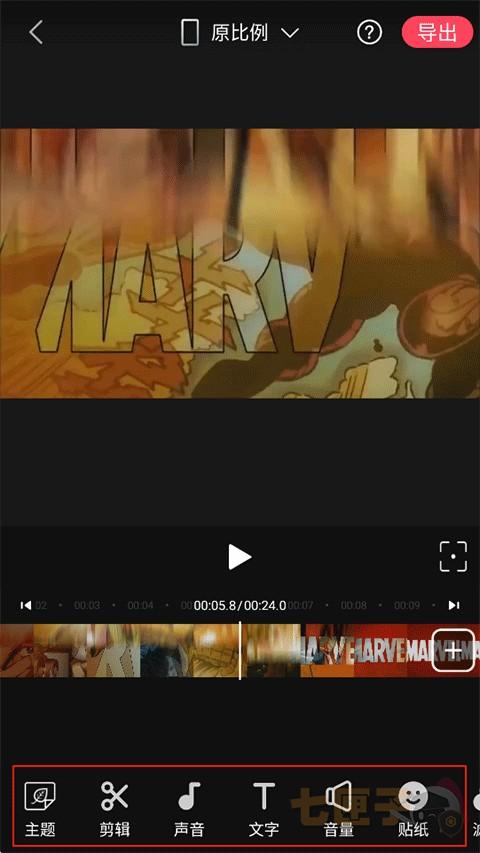 4、下方提供了主题、剪辑、声音、文字、音量、贴纸功能...