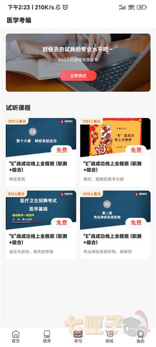 7、点击学习,这里有官方为你专门准备的试听课程和专业水平测试题,看看自己处于哪个阶段;