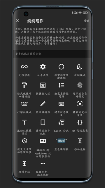 2、还在流畅体验上下了很多功夫,它拥有完美的键盘响应逻辑。使用纯纯写作时,你能够往下拖动快捷输入栏来收起软键盘;能够点击文章某一行后,动态获得合适的光标焦点定位;能够在收起软键盘时,文章位置保持不动...许多这样的细节内容,当你对比使用其他编辑器项目时,你才会发现纯纯写作做得更加出色、流畅,细致入微。