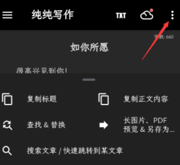 首先第一步,在本页面下载并安装纯纯写作app至手机端。在手机端中打开软件,点击右上角的三个点,然后找到设置下画板标签。如图所示。