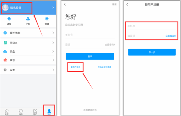 注册:打开安装好的学银在线app,点击右下角“我的”,进入如下左图的界面,点击上方灰色头像,进入如下中图的注册登录界面,选择“新用户注册”,输入手机号并获取验证码。
