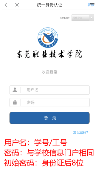 进入学校统一身份认证登录界面,用户名为学号/工号,密码与学校 信息门户(即数字化校园)相同,初始密码为 身份证后8位,初次登录成功后,请按提示修改密码并绑定手机号。