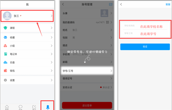 【注意】如果上述方法绑定学号不成功,点击“我”——个人头像,进入账号管理,在“学号/工号”一栏绑定学号/工号。