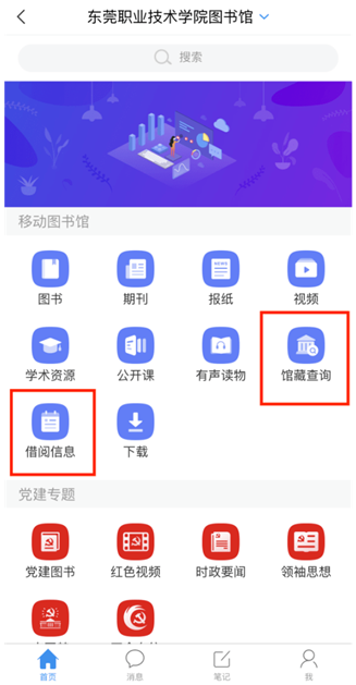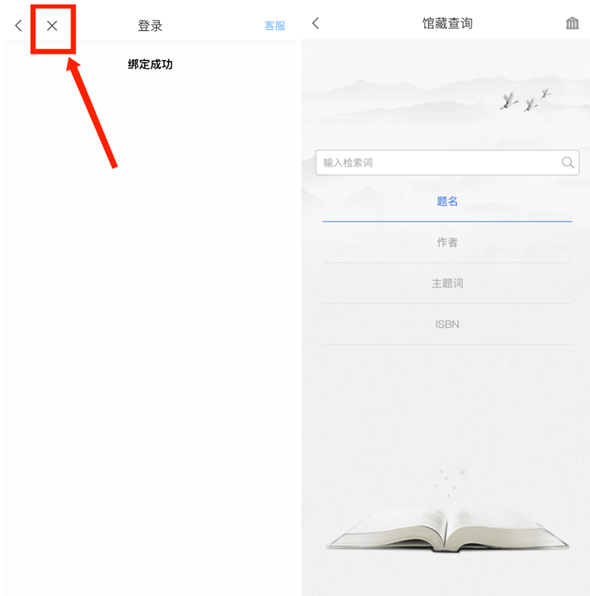 绑定成功后点击左上角的 ×,即可使用“馆藏查询”和“借阅记录”功能。