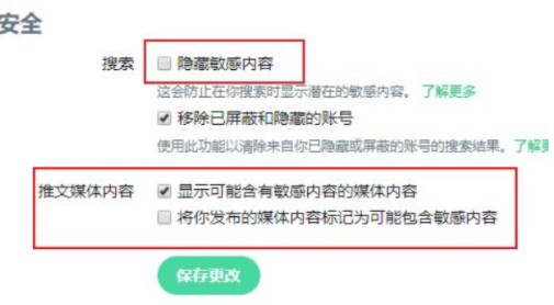 4、在隐私与安全设置选项中找到【安全】-【展示可能包含敏感内容的媒体】勾选,即可解除限制。