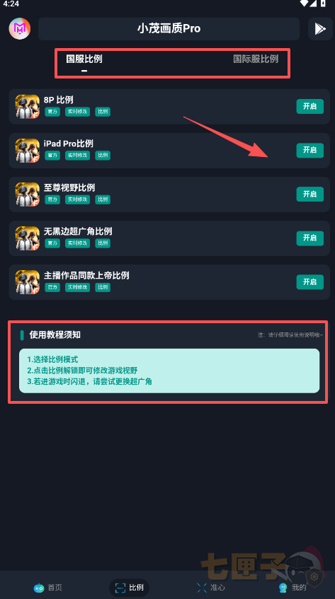 1、“首页”主要展示小茂画质Pro画质增强修改部分,以国服和国际服两个版本为主,可分别在启动进入游戏前进行修改和添加操作。