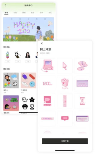 在贴纸中心,你可以随时下载最新素材。没有头绪的时候,不妨看看“推荐”中用贴纸拼贴出的作品。你还能一键下载作品中的所有贴纸,创作属于你的涂鸦动物园或网上冲浪。