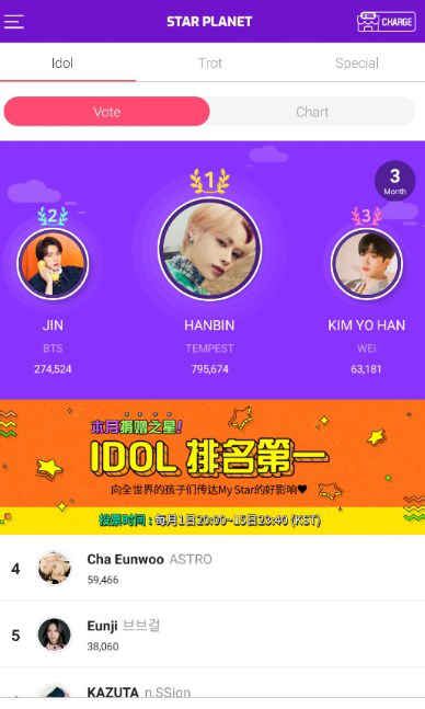 - 偶像排名:支持我最喜欢的偶像并以我的艺术家的名义捐款!