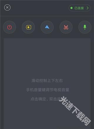 3、等待连接成功之后,就会弹出一个遥控器页面,滑动控制上下左右,手机音量键可调节电视音量,点击确定、双击返回,在页面上方还有按钮,分别代表电源、投屏、镜像、截屏、语音控制功能,输入指定语音口令就能控制播放。