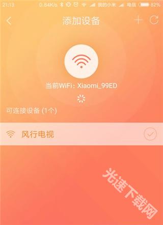 2、点击进入连接,出现"添加设备"页面,选择在同一WIFI下的智能电视,然后点击搜索到的电视名称(仅支持风行电视,其他品牌可能不兼容)。