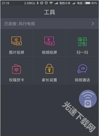 4、退出遥控器页面,进入工具页面,界面中会显示连接的硬件名称,你可以进行图片投屏、视频投屏、扫—扫、祝福贺卡、家长设置、视频通话这些操作。