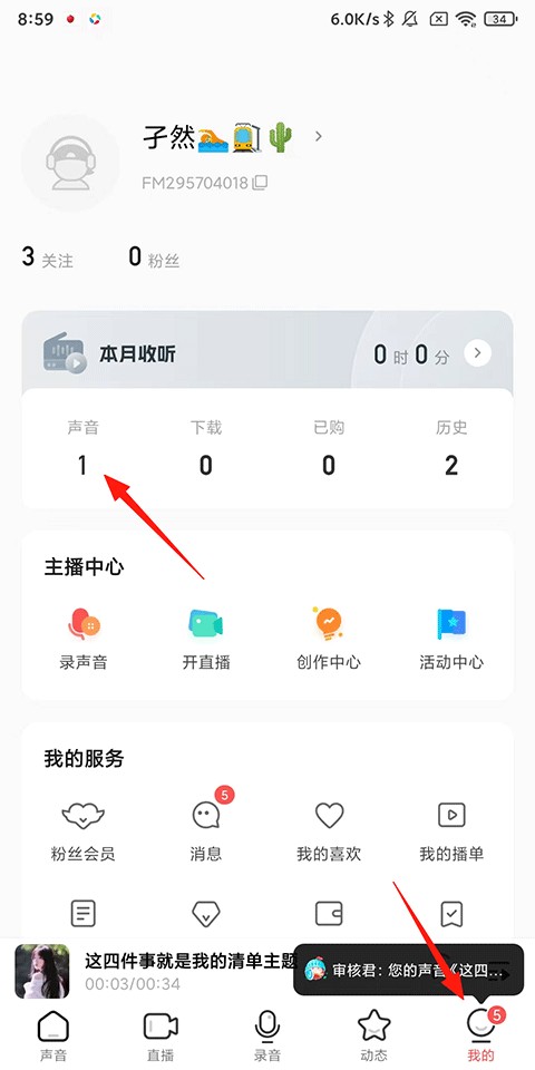 1、打开荔枝,点击【我的】-【声音】(这里保存的是用户已经配音并发布的声音);