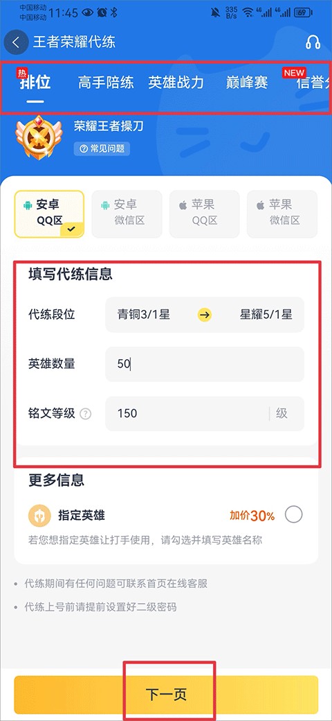 3、进入后你可以选择代练排位、高手陪练、巅峰赛、赏金联赛等,例如排位赛,将代练信息完善后点击下一步
