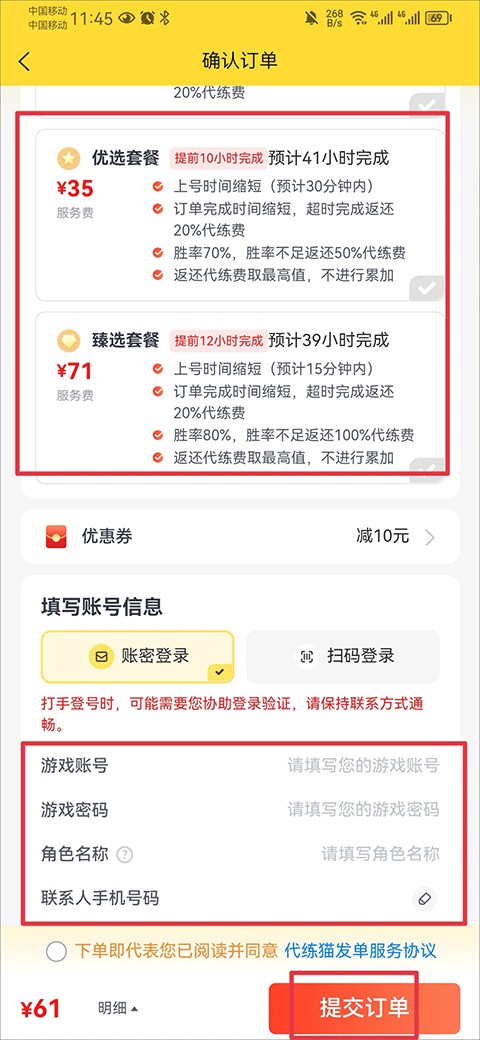 4、最后在确认订单界面中选择套餐、并将账号信息完善后点击提交订单并完成支付即可