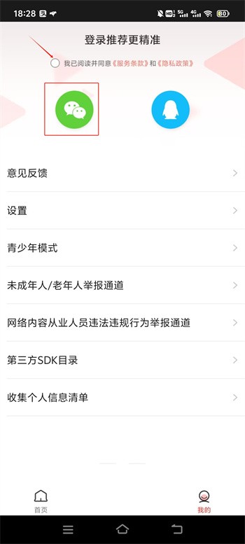 2、这款软件一个有两个登录途径,根据你以前登录方式进行选择,首先点击上方的条款与政策同意按键,然后选择自己的登录方式;