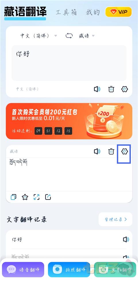 2、点击藏语翻译框右边的设置图标。