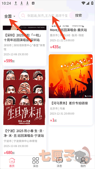1、在本站下载安装河马票务app并打开,进入app后直接通过搜索功能和城市切换功能,将需要的场馆门票进行检索