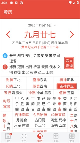 根据你选择的日期详细呈现黄历信息,包括宜忌、方位、五行、冲煞等,还可进行吉日查询。
