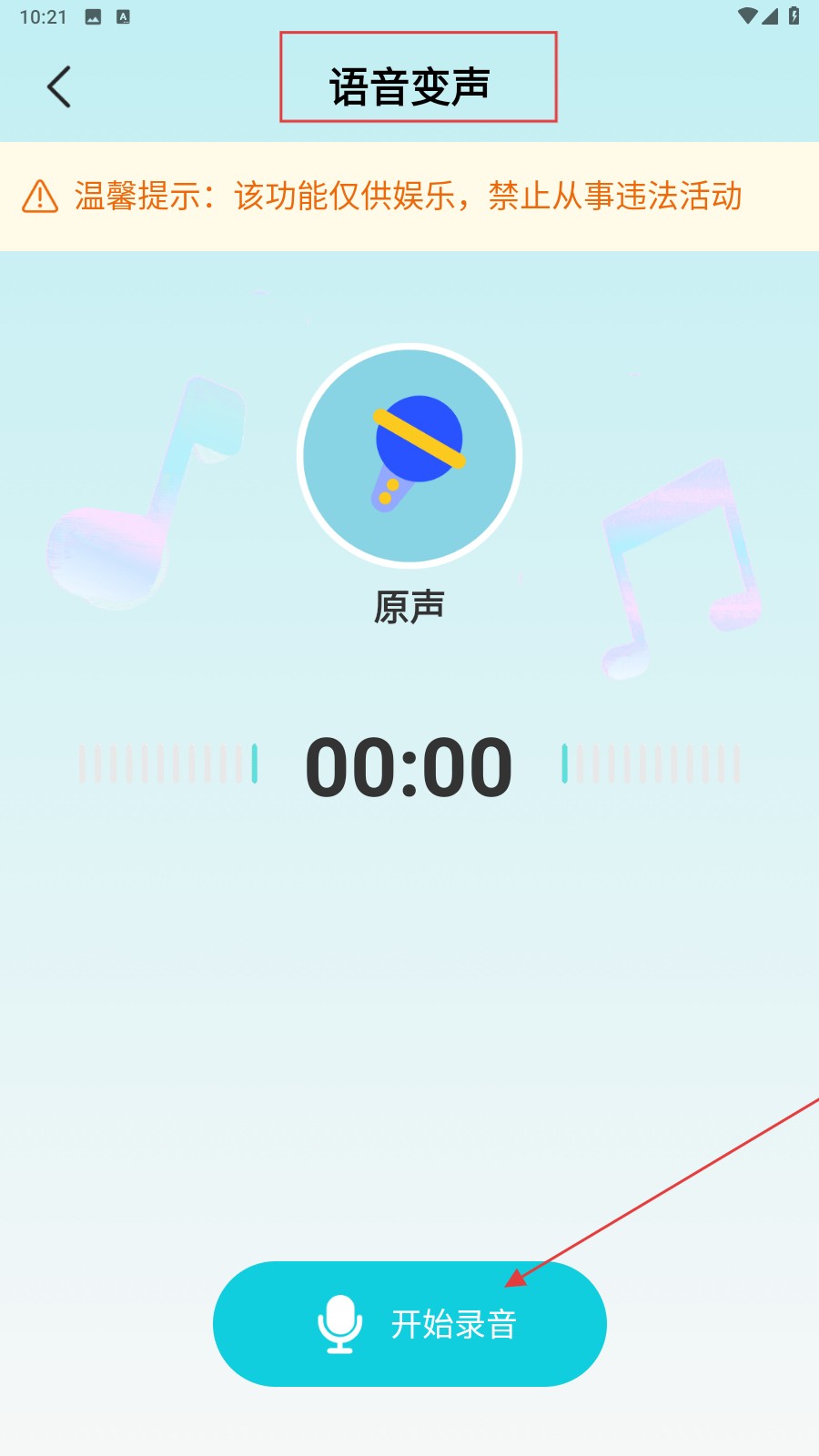 2、在语音变声页,点【开始录音】录制要变声的语音。