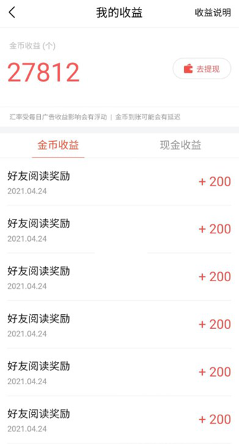 点击“现金收益”,今日头条极速版的所有金币会自动兑换成现金;