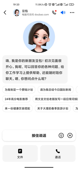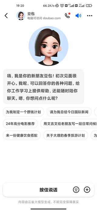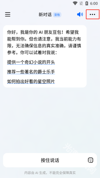 2、进入APP后,按住下面的【按住说话】就可以跟豆包沟通了,也可以使用文字输入;