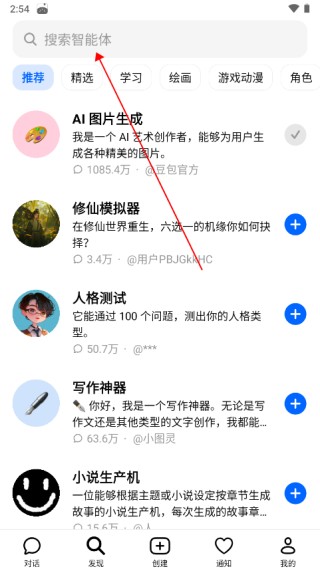 2、在发现页面,点击搜索栏,输入想要的AI智能体
