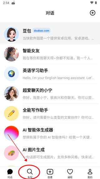 1、进入豆包人工智能,点击下方发现