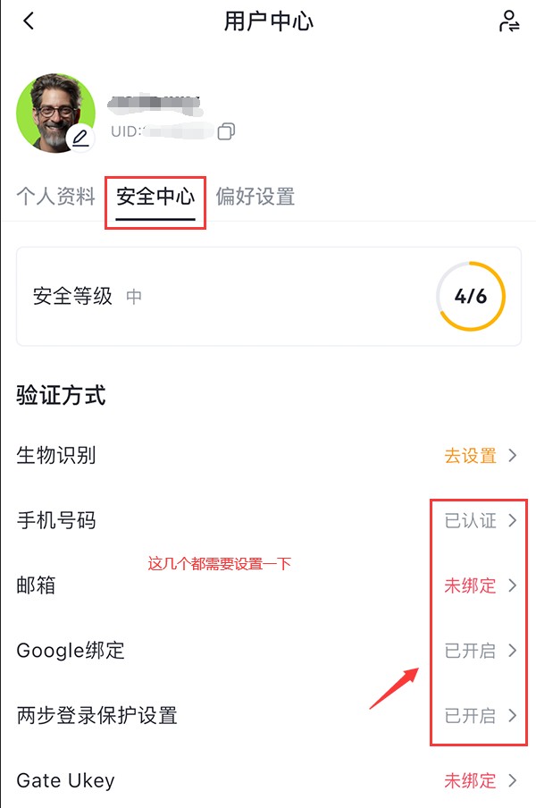 选择 安全中心 这个里面的 四个都要设置一下 尤其是 Google绑定、邮箱