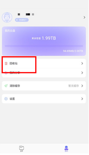 点击我的,可以查看剩余容量,回收站,分享历史等