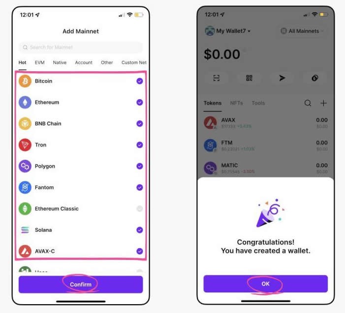 2、BitKeep作为多链钱包,在创建钱包时为方便用户使用,默认勾选了部分主流公链,若有不需要的公链,或更多要增加的公链,用户可在该页面手动搜索和勾选,完成公链选择后点击“Confirm”,创建成功后点击“OK”即可。