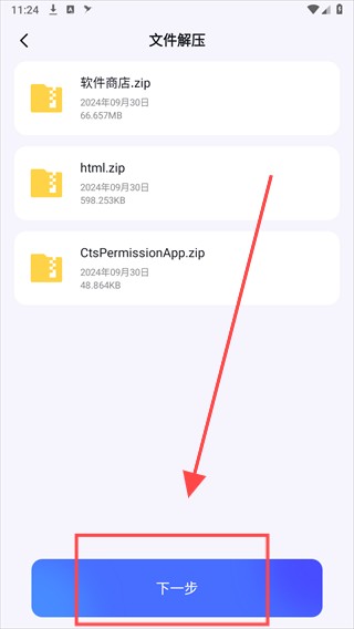 2. 接下来进入文件解压操作界面,选中目标压缩包,点击右下角的【下一步】以继续操作。