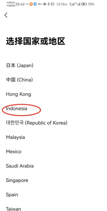 3、选择国家或地区中点击“Indonesia”