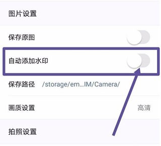 4、在该页面中寻找到“自动添加水印”这一选项。需要注意的是,beautycam美颜相机所提供的水印为固定样式,用户无法自行进行设计或更改。