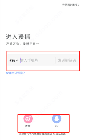 1、首先进行账号登录,支持使用手机号、微博、QQ三种登录方式;