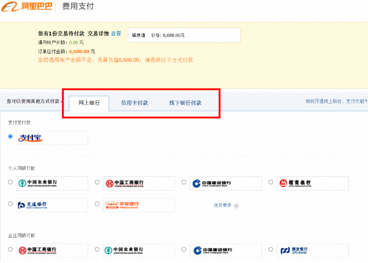 如果您是在线订购的诚信通,建议您直接在订单中点击付款页面,然后选择在线付款方式(支付宝、网上银行),或者在后台查看您的银行专属账号进行汇款。(专属账户在订单支付中可查看)