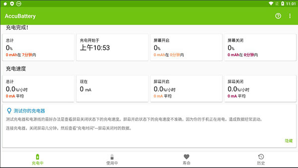 1、打开Accubattery Pro中文版,在充电中可以看到电池的损耗和剩余情况;
